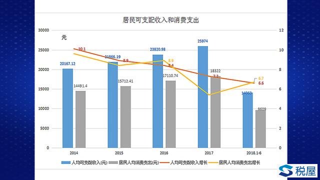 居民可支配收入,从这张表上可以看到,居民可支配收入的增长速度实际上比较慢的,是在所有的各个宏观指标中是增长速度最慢的,因为我们目前来说我们的GDP就是总的指标来说,上半年是6.8%,可是我们现在可以看到居民可支配收入这个红线是6.6%,也就是说目前我们居民可支配收入,居民到手的钱可以用的钱才是6.6%,比GDP的增长速度低了0.2百分点,更不要说其他方面了。