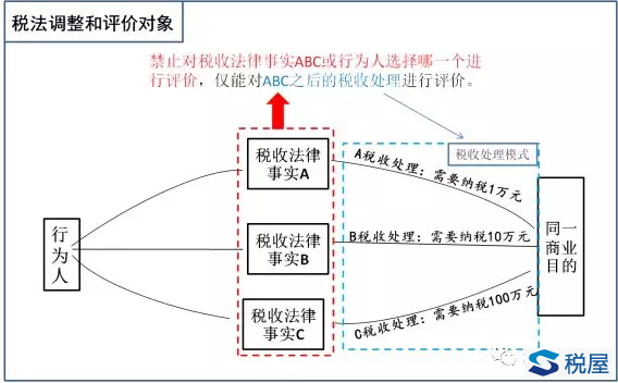 以图中为例,行为人如果觉得税收法律事实A的税款更低,而选择了税收法律事实A,则属于税收筹划,对行为人的税收行为是否违法的评价只能建立在税收事实A的基础上,禁止以并未出现的税收事实B、税收事实C作为评价。