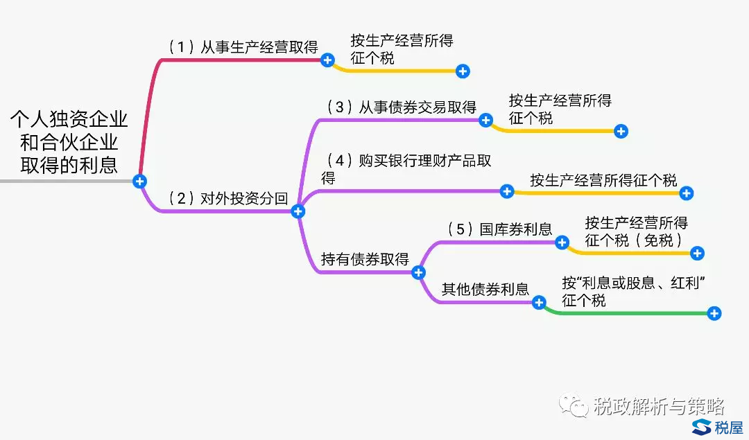 从91号来看,个人独资企业从事生产经营以及与生产经营有关的活动所取得的利息收入应比照个人所得税法的"个体工商户的生产经营所得"应税项目,计算征收个人所得税。