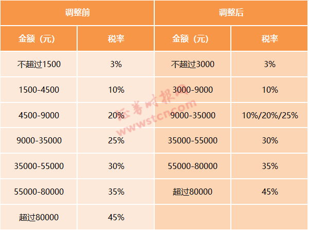 举个例子,不考虑社保公积金等因素,月收入8000元的,之前要纳税(8000-3500)*10%-105=345元,改革后最多交(8000-5000)*3%=90元。
