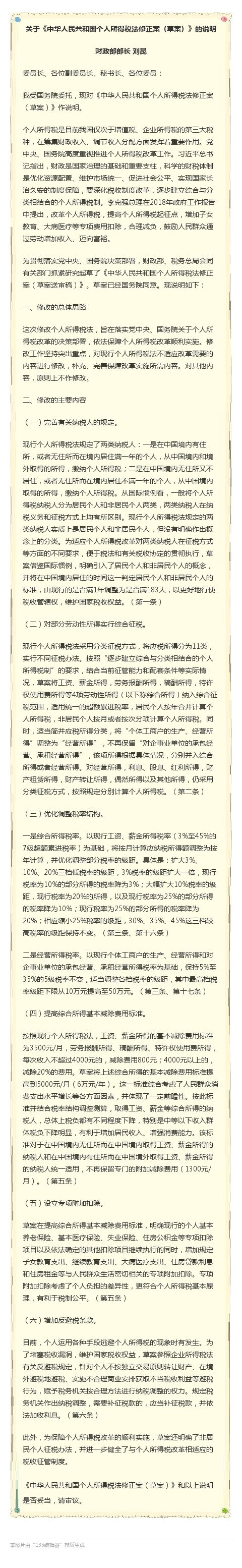 2018年6月19日,《中华人民共和国个人所得税法修正案(草案)》出炉,个税起征点将从3500元提高到5000元,工资薪金、劳务报酬、稿酬和特许权使用费等四项劳动性所得首次实行综合征税,增加子女教育支出、继续教育支出、大病医疗支出、住房贷款利息和住房租金等专项附加扣除。算算你的个税降多少!增加多项抵扣,6大悬念待解 |