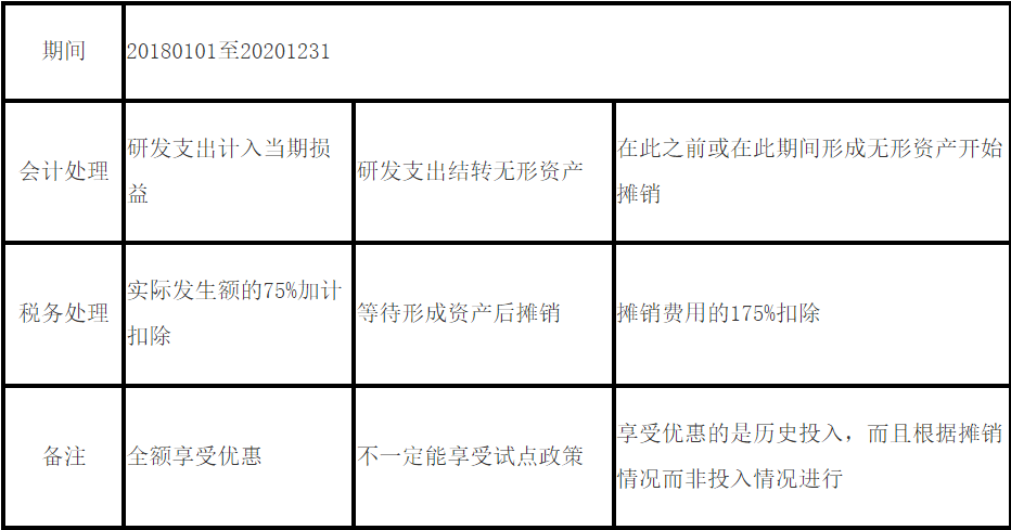 该规定和适用范围从表明上看来没有任何问题,但由于试点期只有三年,费用化和资本化带来的时间性差异就可能造成重大的差异。换句话说,对于同样在2018和2020进行研究开发活动的企业,如果这个企业选择了费用化相关费用,就可以直接享受该文件的优惠;而如果选择了将当期研发费用资本化成无形资产在当期就无法享受优惠,期后的优惠存在不确定性。