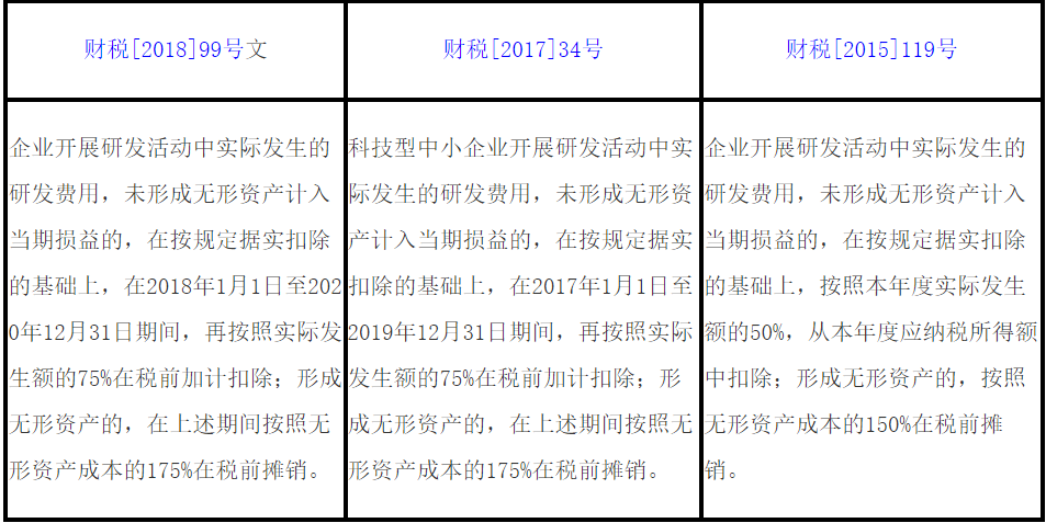 为了支持科技创新,激励企业加大研发投入,财税部门于2018年9月20日发布了《关于提高研究开发费用税前加计扣除比例的通知》(财税〔2018〕99号文)。文件很简单,主要是在财税〔2015〕119号和财税〔2017〕34号的基础上,将企业研发费用加计扣除比例提高到75%的政策由科技型中小企业扩大至所有企业,但由于是试点政策,期限暂定为文件发布所属纳税年度起满三年。