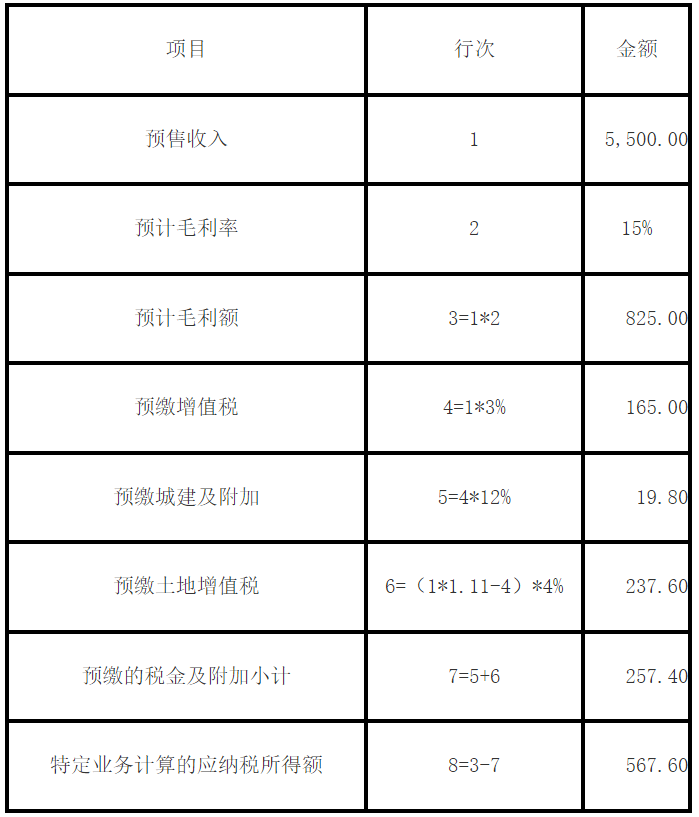 预缴申报表的特定业务计算的应纳税所得额=预计毛利额,而年度纳税申报的特定业务计算的纳税调整额=预计毛利额-实际发生的营业税金及附加、土地增值税。目前,部分税务机关对这一问题进行了明确,但也有不少地区并未对此进行说明。