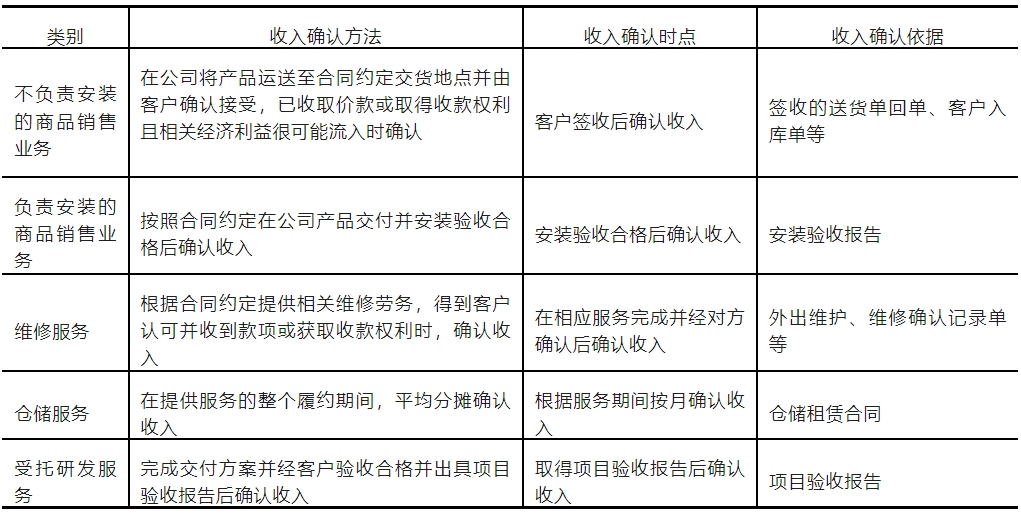 (1)发行人各类业务的收入确认方法、确认时点及依据 根据收入确认政策不同,可将发行人收入分为不负责安装的商品销售业务、负责安装的商品销售业务、维修服务、仓储服务和受托研发服务。除部分轨道交通车辆部件产品需安装外,风电机组罩体、风电轻量化夹芯材料以及大部分轨道交通车辆部件等主要产品无需提供安装服务,具体收入确认政策如下: