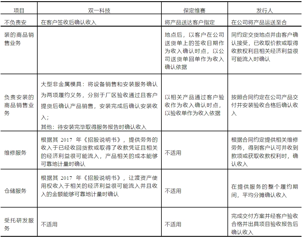 (2)发行人与同行业可比公司的收入确认政策 发行人各类业务的收入确认政策与同行业可比公司不存在重大差异,对比如下:
